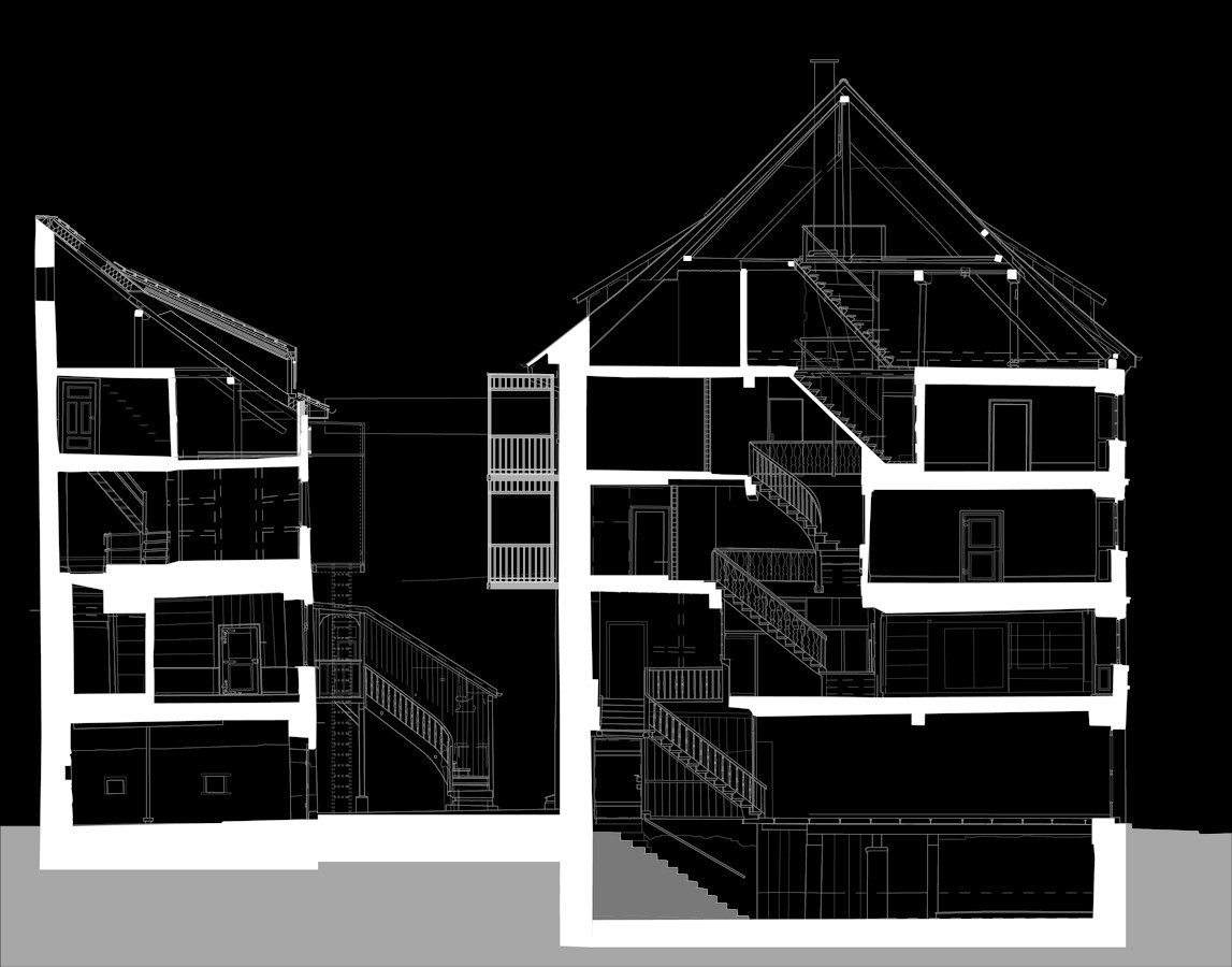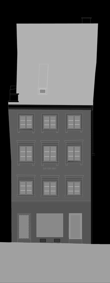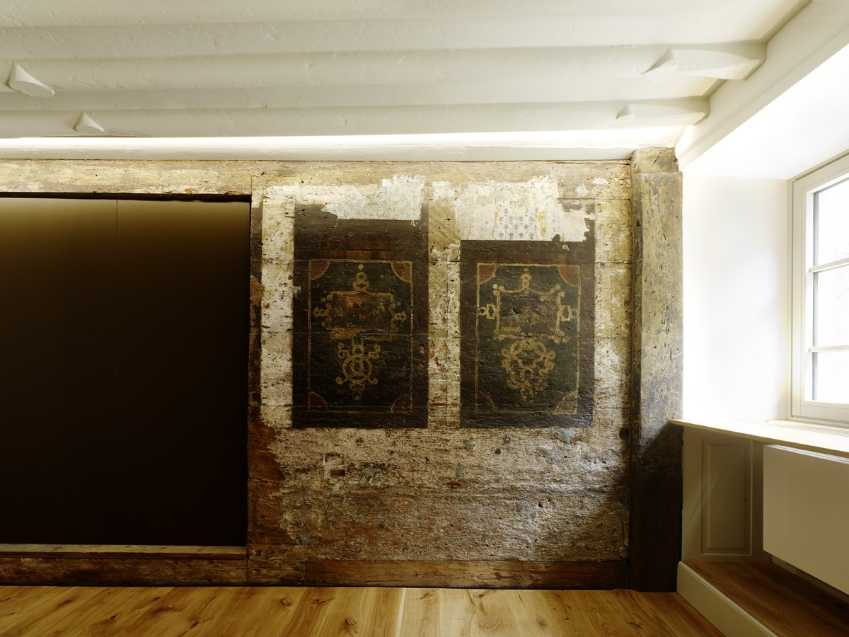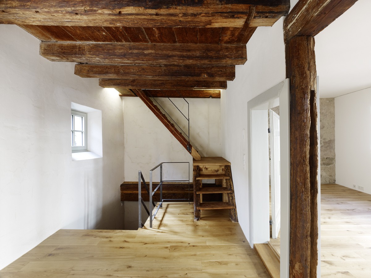 durch contemporäre neue architekturelemente und möbel ergänzt. die unterschiedlichen historischen grundrisse, raumfolgen und fassaden werden wieder freigelegt, in ihrer struktur belassen und exakt herausgestellt. im innenhof wird der plastische, historische, freistehende treppenaufgang durch zwei an das hauptgebäude und an den turm angesetzte kleinbaukörper ergänzt. zum einen eine loggia mit einer fassade aus holzwerkstoffplatten mit scherenschnittmotiven, analog den bestehenden historischen innenraumgeländermotiven, zum anderen eine schmale balkonstruktur mit liegenden stahlelementen.