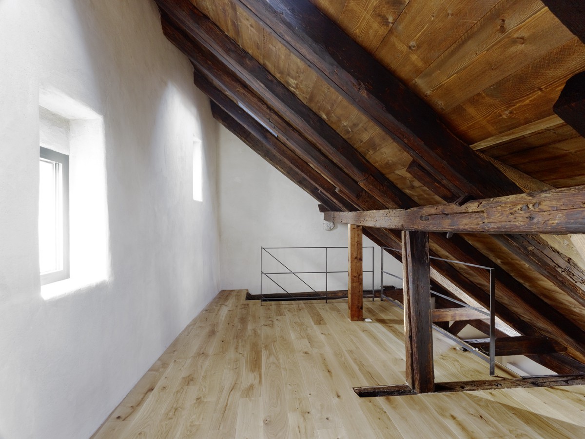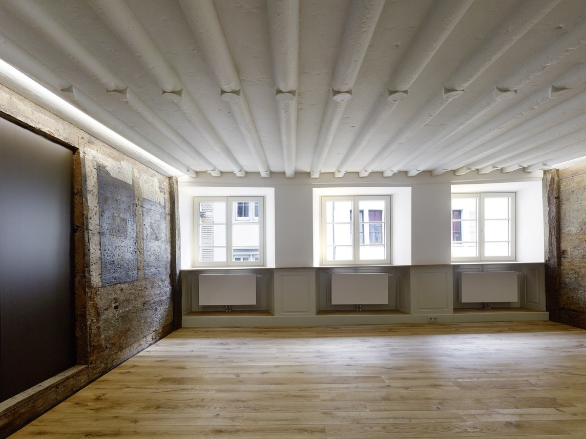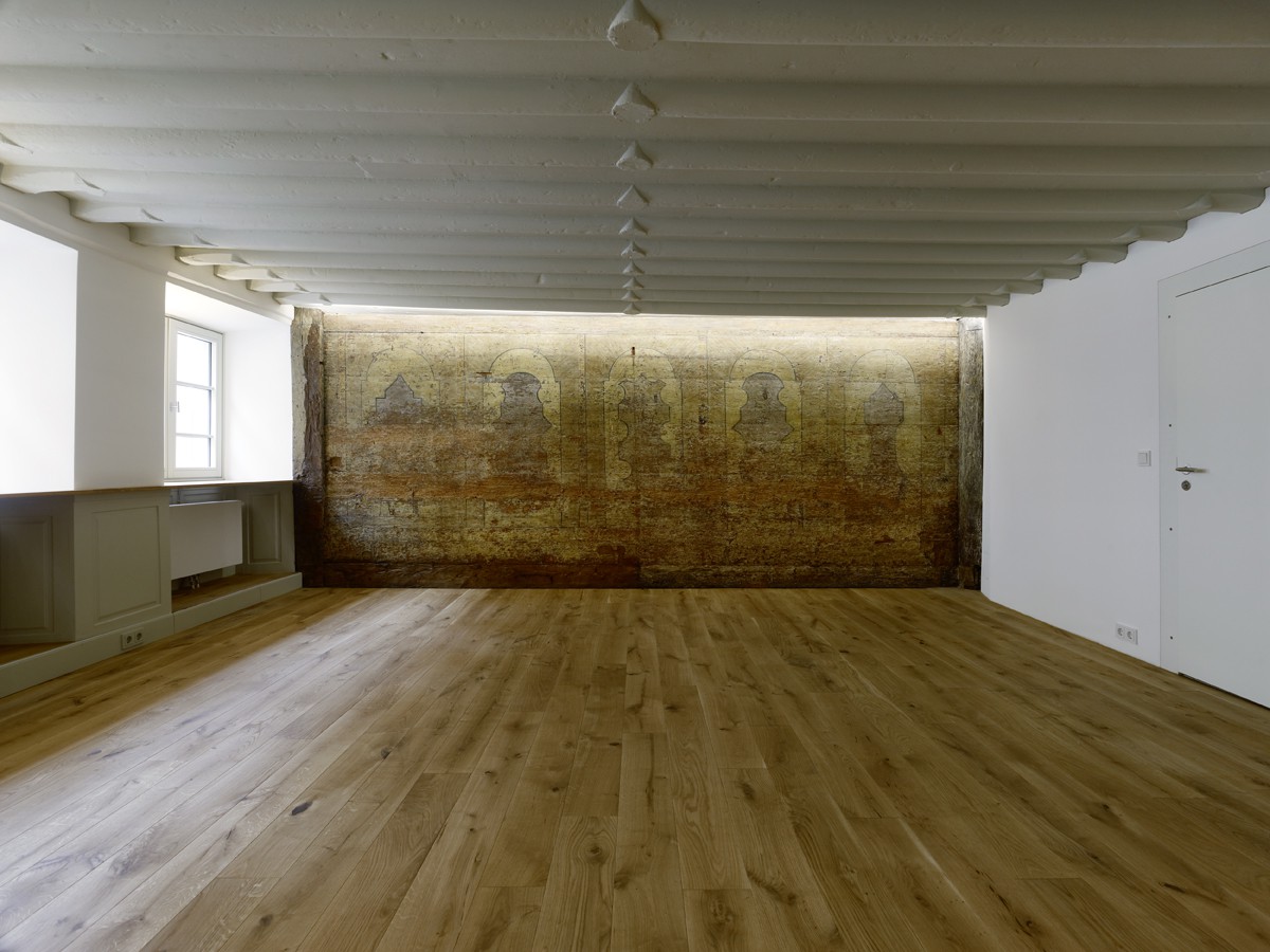 durch contemporäre neue architekturelemente und möbel ergänzt. die unterschiedlichen historischen grundrisse, raumfolgen und fassaden werden wieder freigelegt, in ihrer struktur belassen und exakt herausgestellt. im innenhof wird der plastische, historische, freistehende treppenaufgang durch zwei an das hauptgebäude und an den turm angesetzte kleinbaukörper ergänzt. zum einen eine loggia mit einer fassade aus holzwerkstoffplatten mit scherenschnittmotiven, analog den bestehenden historischen innenraumgeländermotiven, zum anderen eine schmale balkonstruktur mit liegenden stahlelementen.