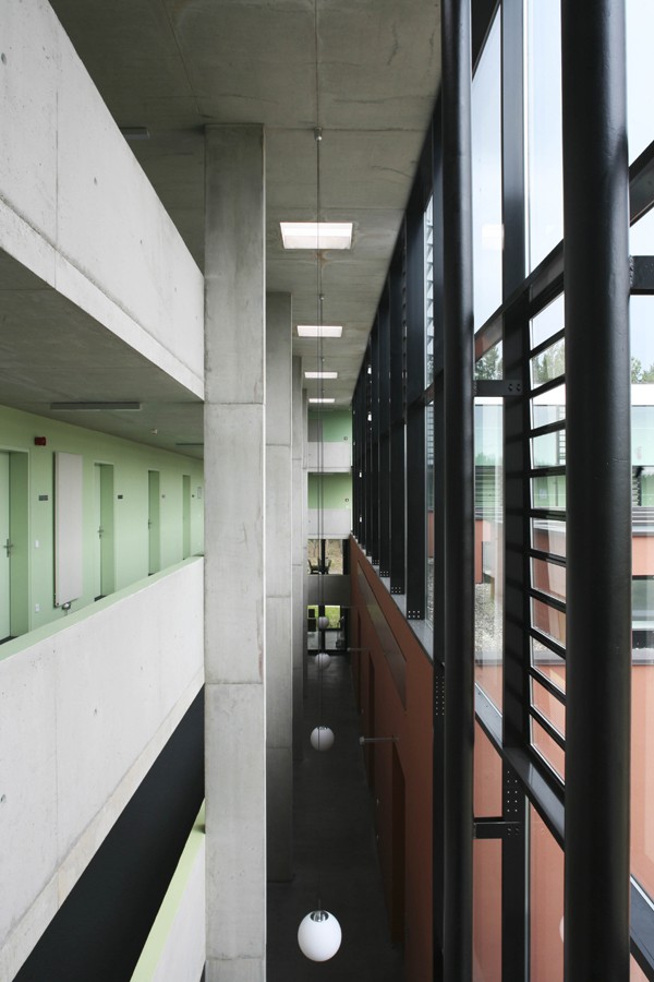 das neue haus zeigt sich als transparente, einbündige anlage, die sich als winkel zum haus 1 richtet. die winkelform wird aus der ecksituation weitergeführt. der endpunkt des mäanders wird durh den kreistagssaal gebildet, der an der nahtstelle zu gebäude 6 den haupteingang definiert.