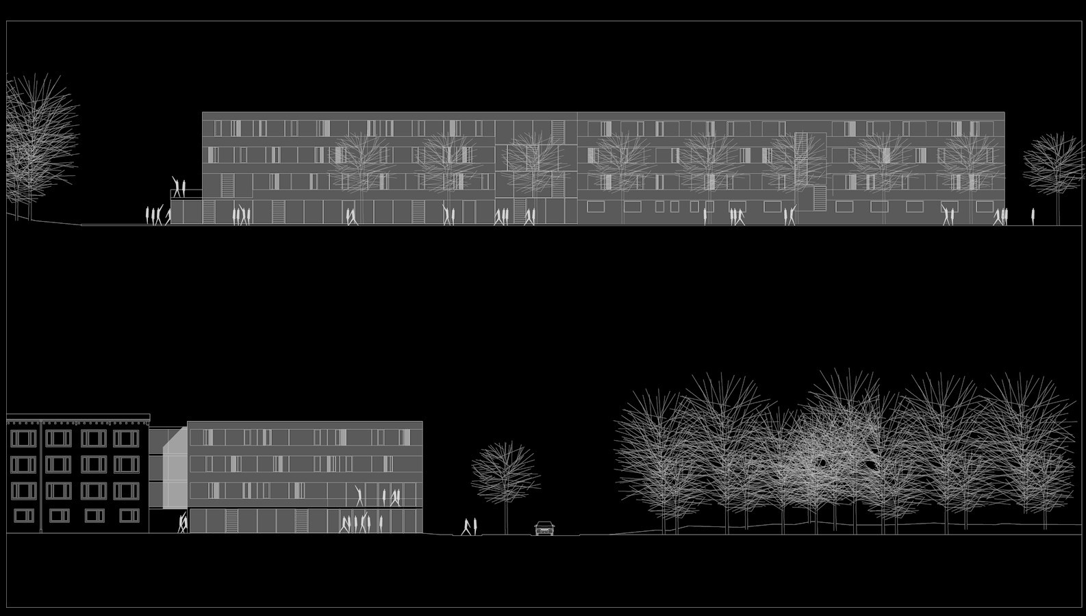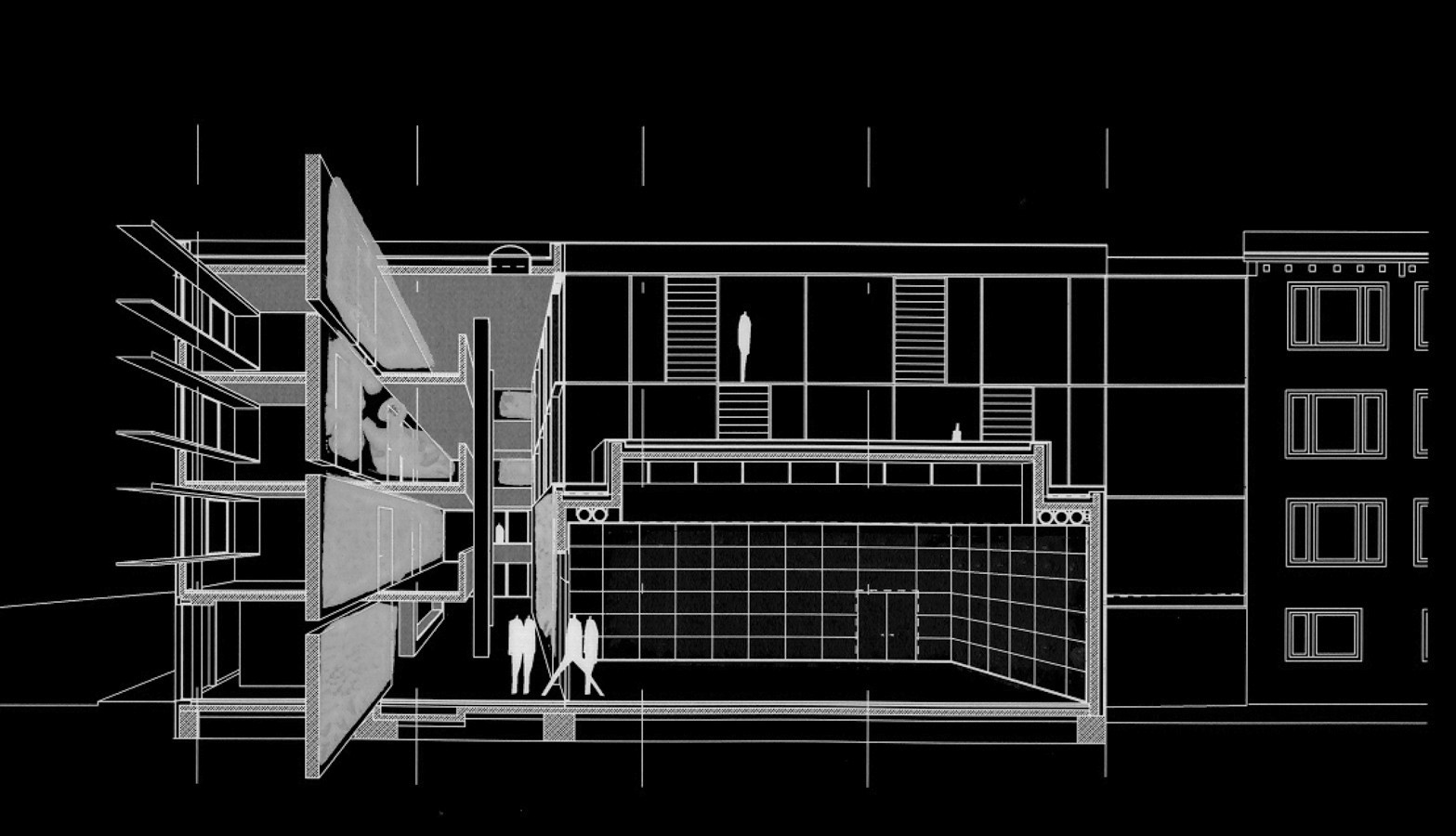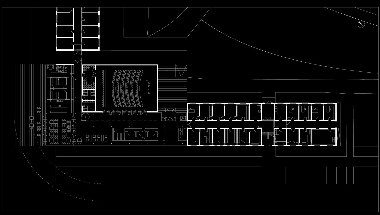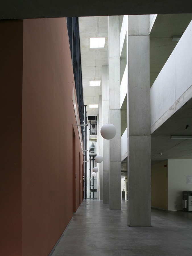 das neue bauwerk wird nicht als glied zwischen die bestehenden gebäude eingepasst, sondern unter einbindung bestehender gebäude entwickelt. im gegensatz zu den bestehenden, in weiten teilen geschlossenen baukörpern, wird der neubau als offenes, öffentliches gebäude entworfen.