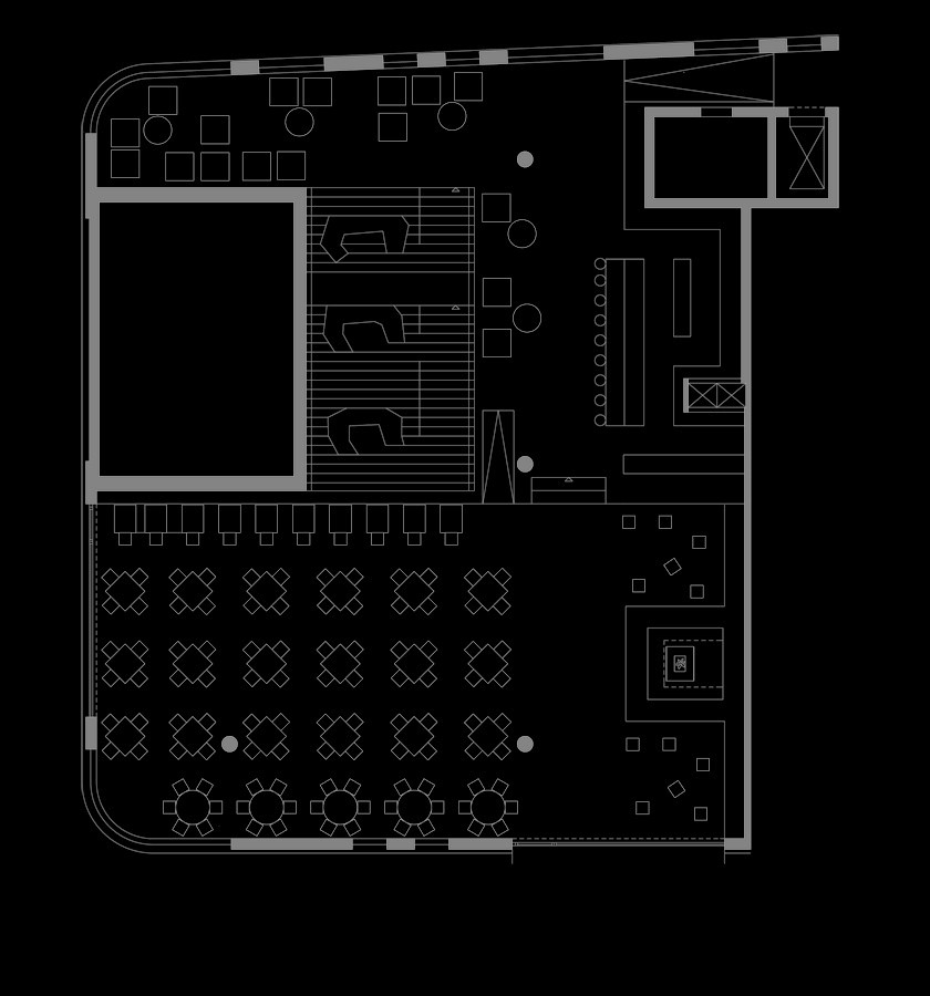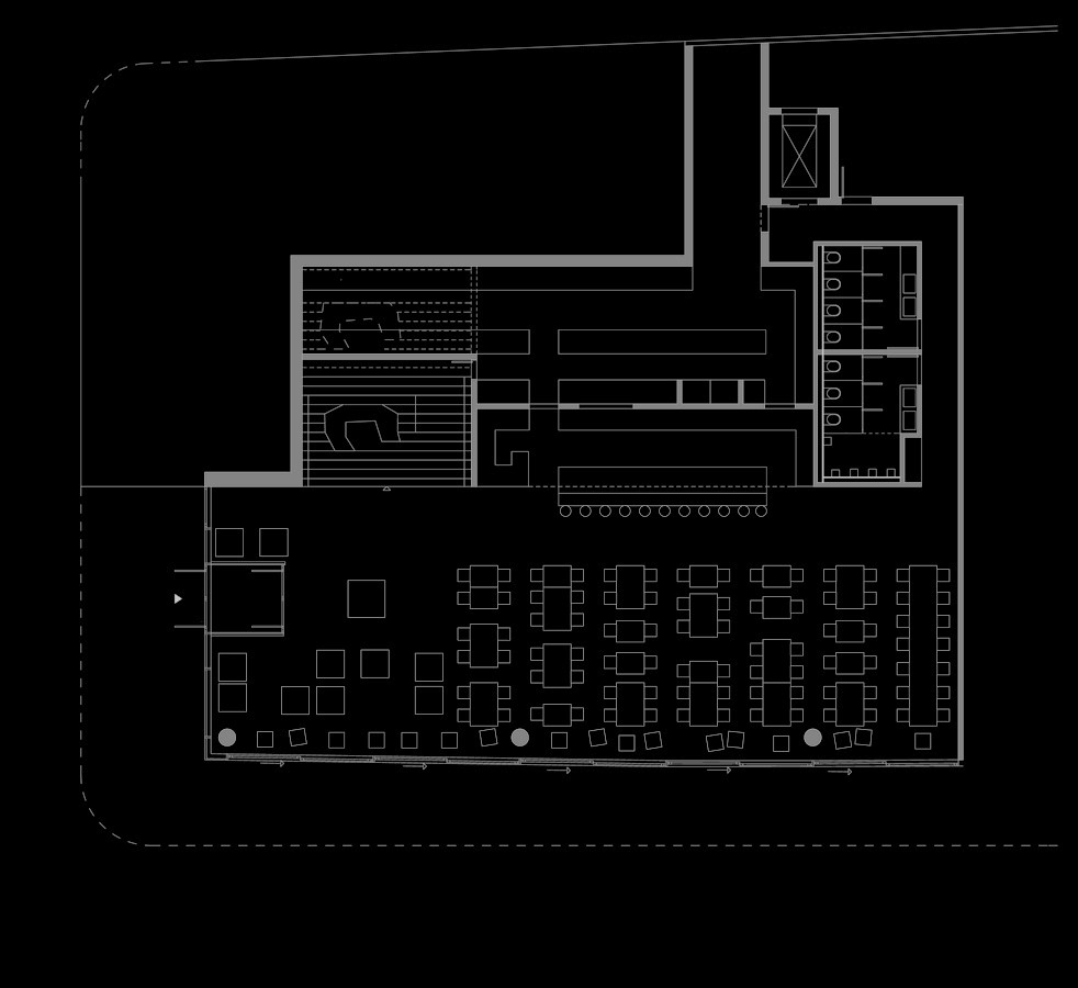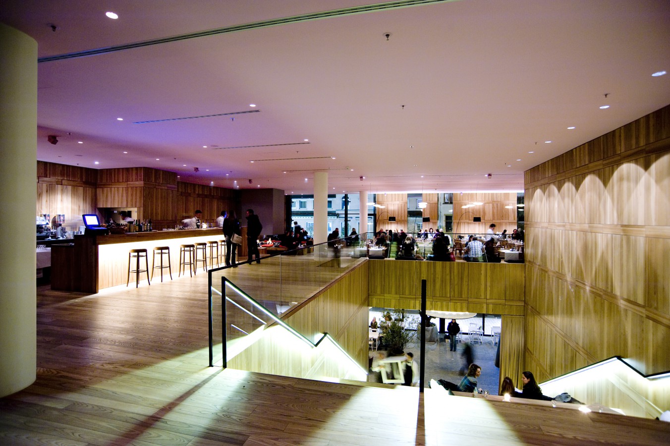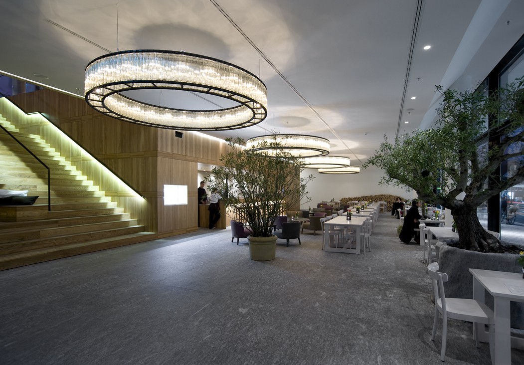 für das restaurant il boccone wurde das konzept vorgeschlagen, ein großes zweigeschossiges raumvolumen mit einer die geschosse verbindenden bespielbaren großtreppe zu konzipieren. im erdgeschoss wird das restaurant als kantine mit schiebeelementen zur aussenbestuhlung und mit an den straßenbelag assoziierenden grantiboden mit einfachem weissen gestühl entwickelt. im obergeschoss entsteht ein stadtchalet mit der atmosphäre von umgreifender holzvertäfelung, holzböden, der großen holztreppe ins erdgeschoss, kaminfeuer und der saalbestuhlung der 1920er jahre, welches mit einer rosa lackierten decke seinen raumabschluss findet.