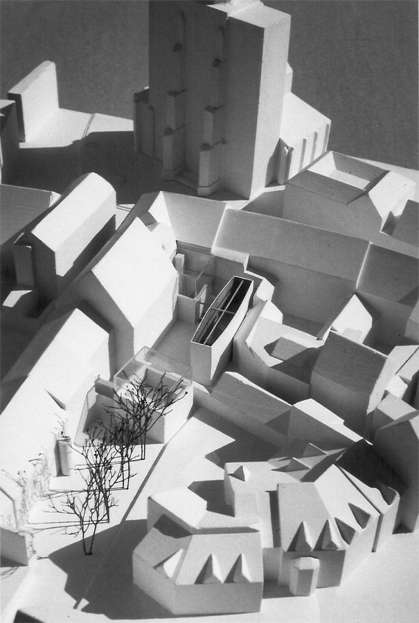 das wettbewerbsgebiet wird durch das münster und seine historische umgebung geprägt. das kulturzentrum, das mit seinen verschiedenen institutionen in diese bebauung integriert wird, erstreckt sich über mehrere gebäude hinweg entlang der so genannten wessenbergstraße und der katzgasse. durch die Schließung des Quartiers, den Neubau an der ecke, erhalten die kulturinstitutionen ihr eigentliches zentrum mit gemeinsamem eingang neben den bestehenden eingängen. die hofbebauung - turmhaus katzgasse 1 - und turmhaus katzgasse 5 - werden durch ein weiteres körperhaftes element ergänzt. mit dem eckgebäude wird versucht die traditionellen städtebaulichen und körperlichen gesetzmäßigkeiten zu zerlegen und diese neu zusammenzufügen. als konstruktion wird eine dem bücherregal verwandte stapelartige rahmenkonstruktion gewählt, welche die eckaussteifung aufnimmt, als auch den bestehenden fresken bestand gewährt. die fassade besteht aus drei teilen, aus der äußeren, horizontale gegliederten glasfassade, die die rein schützende und schließende funktion des gebäudes übernimmt (haut); aus einem eingestellten winkel als element der lochfassade und aus dem konkret definierten eingang. das dach folgt den firstlinien der umgebenden bebauung.