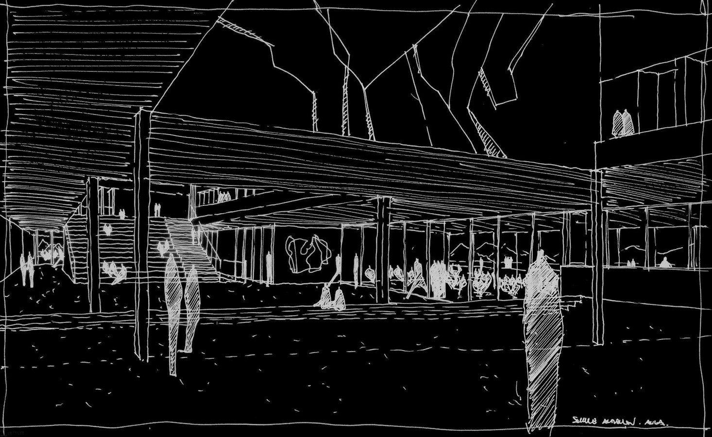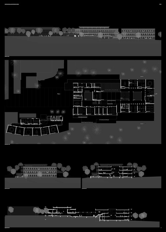 das sport- und schulzentrum der gemeinde aldingen liegt am nördlichen siedlungsrand des ortes und bildet mit den gebäuden der gemeinschaftsschule, sporthallen und schwimmhalle einen campus. auf einer leichten anhöhe gelegen, platziert sich das schulzentrum mit weiten aussichten in die landschaften und auf die schwäbische alb. das heutige sehr gut erhaltene schulgebäude in sichtbetonbauweise aus den 70er jahren bildet den schwerpunkt des schulzentrums in aldingen. das bauwerk orientiert sich um ein zentrales quadratisches innenatrium, von welchem aus übersichtlich die funktionen erschlossen werden, zum campus öffnet sich die mittige halle. das entwurfsprinzip des bestehenden gebäude besteht aus sich übereinander schichtenden betonscheiben, welche mit unterschiedlichen sichtbetonbrüstungen übereinandergelagert sind. mit dem vorgeschlagenen entwurfskonzept für die erweiterung des schulbaukörpers zur gemeinschaftsschule werden die inhalte des bestehenden bauwerks sehr respektiert und der vorgefundene entwurfsansatz fortgeführt, dies mit einer klar ablesbaren eigenständigen contemporären architektur. die bauwerksebene des erdgeschosses wird städtebaulich nach norden vergrößert, so entsteht eine ein- bis zweigeschossiges basisfläche, auf welcher leicht abgerückt das neue obergeschoss analog dem bestandsobergeschoss entwickelt wird. im gesamtentwurf entsteht ein kompakter baukörper, der an den beiden endpunkten der rechteckigen gesamtform zwei hochpunkte zeigt. die sichtbetonarchitektur des bestehenden bauwerks soll erhalten und sorgfältig saniert werden. die erweiterung übernimmt die funktionalen und gestalterischen inhalte und führt den duktus fort, es entsteht ein neues kompaktes, quadratisches bauwerk mit übereinandergestapelten sichtbetonscheiben mit scheibenzwischenräumen.