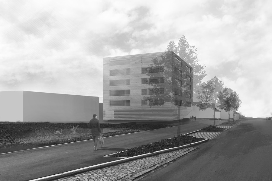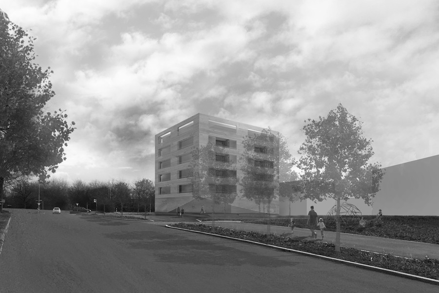 es wird vorgeschlagen ein markantes, präzises, kubisches 6 geschossiges wohnprojekt in massivholzbauweise oder alternativ in massivbauweise, vom gelände durch einen zurückliegenden betonsockel leicht abgehoben auf dem tiefgaragengeschoss, zu errichten.