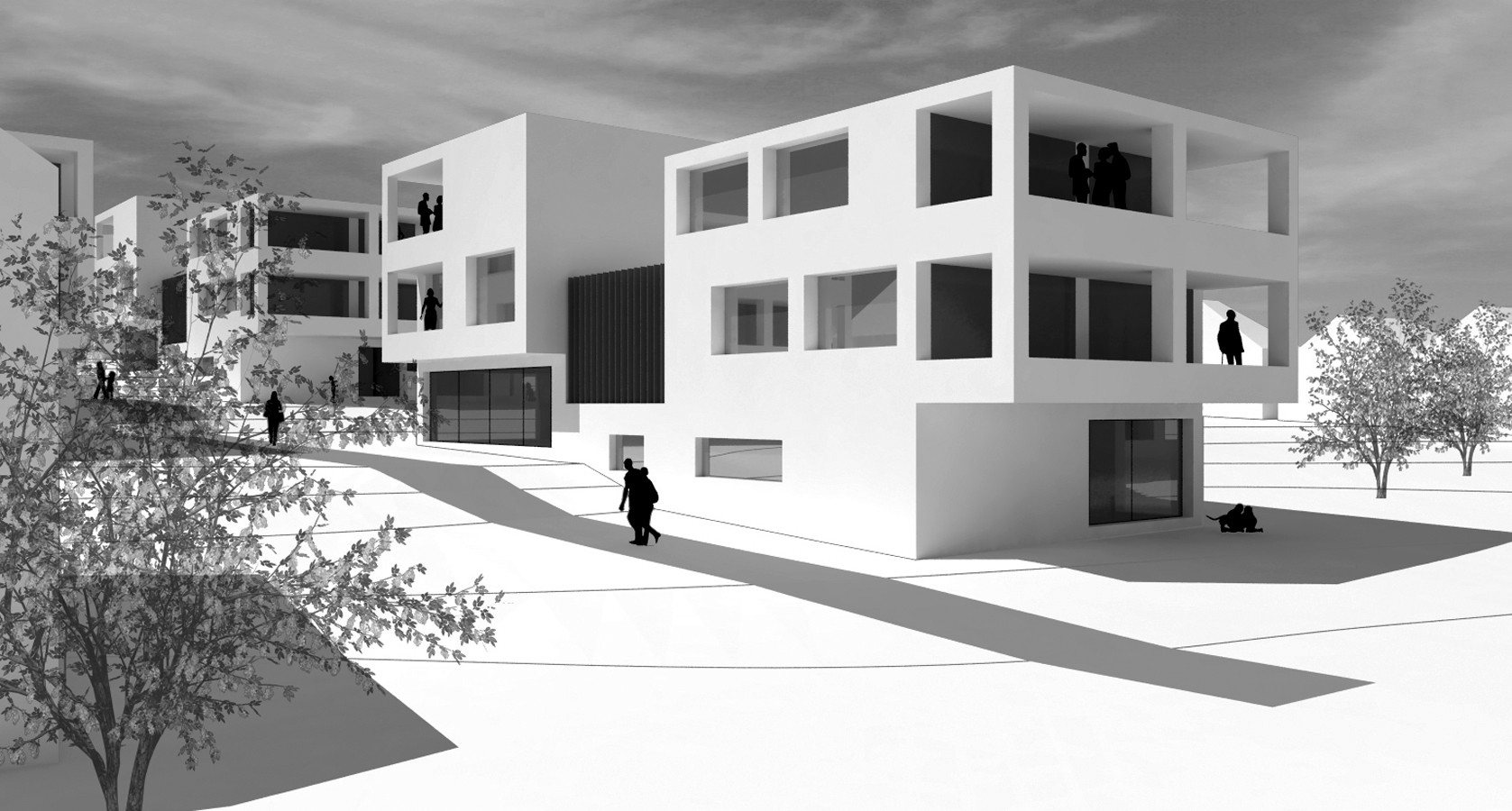 Ziel ist es,dieTopographie des Geländes wieder sichtbar zumachen. In den Wiesenhang werden die Baukörper integriert. Entsprechend der Hangneigung werden Streuobstbestände eingefügt. Durch Bündelung der Höhenlinien entstehen geneigte Hangterrassen,die bis an die Gebäude hin fließen. Das integrierende Thema der Wohnanlage ist der Wiesenhang, der auch den Charakter bestimmt. Lediglich ein Erschließungsweg windet sich zwischen den Häusern durch, um die fußläufige Erschließung so reduziert als möglich zuhalten. Zugunsten der Gesamtwirkung wird auf den Einschnitt von freiräumlich flächigen Gemeinschaftsanlagen verzichtet, Wertgelegt wird auf einen durchgängigen Grünraum und einen ökologisch/naturhaft reduzierten Charakter der Anlage.