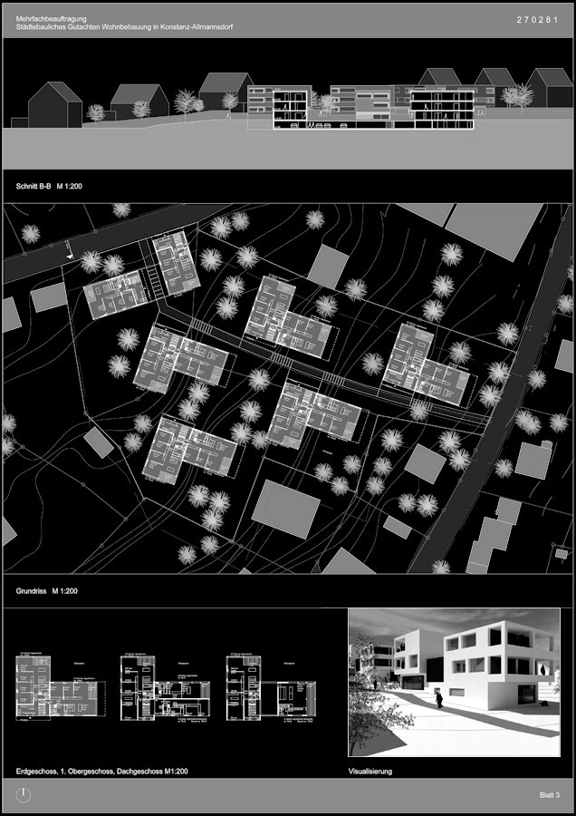 2 geschossige Baukörper mit Dachgeschoss als Splitt Level Grundriß. Monolithischer Kubus mit Akzentuierung und Auskragung als Eingangsüberdachung und in Seerichtung. Differenzierung der Baukörper und Aussenräume, konsequente Abstaffelung und Orientierung der Wohnhöfe zum See. Die Erschließung erfolgt ausschließlich von den Wohnhöfen abgewandt zwischen den Körpern.