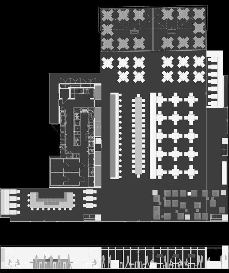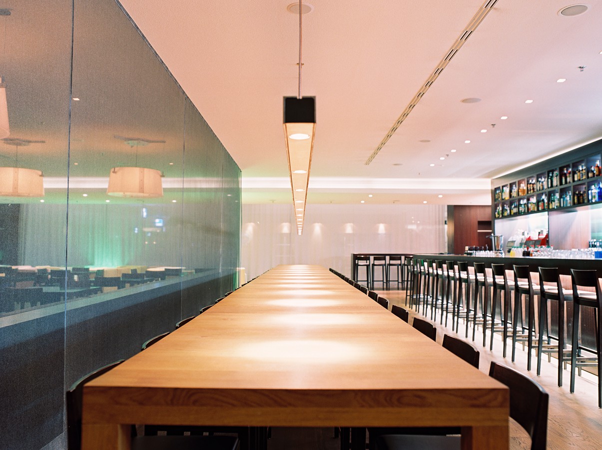 auf einer fläche im 1. obergeschoss des lago shopping centers in konstanz, wurde das deli restaurent . cafe . bar entworfen. das konzept sieht vor, durch maximale transparente fassaden, das restaurant als offene, moderne fläche in das einkaufzentrum hinein zu öffnen und mit unterschiedlichen schriftzügen die inhalte des essens und trinkens zu vermitteln. der zentrale innenraum wird durch die bar mit dahinterliegenden serviceeinheiten und der küche geordnet. als dunkles möbel aus mahagoniholz werden die bar, verschiedene möbel und die nebenräume gefasst und ermöglichen die bezüge in die anschließenden bereiche. die bar wird durch einen hochtisch ergänzt, der einerseits die kommunikation fördert und die höhen der bar und der esstische vermittelt. durch einen metallhaltigen, schwarzen vorhang kann diese zone von den esstischen abgegrenzt werden, so dass die benachbarten nutzungen halbtransparent zu erkennen sind. im restaurant entstehen die unterschiedlichen zonen sushi bar, lounge, langtisch, empore, grosser raum. das deli zeigt sich als offenes, modernes restaurant
