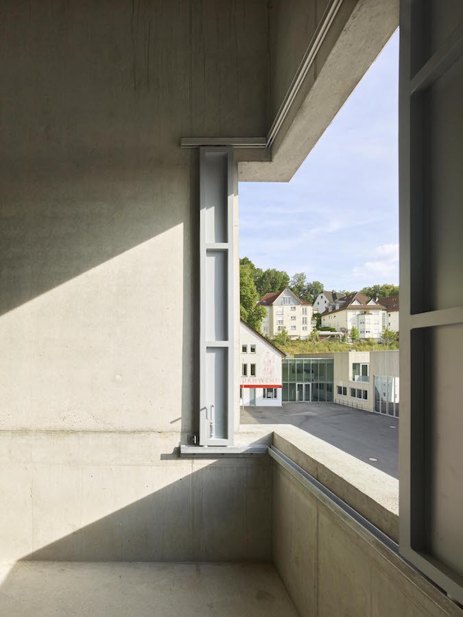 das gesamtgebäude ist in sichtbeton, sodass alle stützen, wände innen sowie decken in robustem beton sichtbar sind. die fassaden sind mit sägerauher brettschalung holzverkleidet und mit sägerauer brettschalung betongeschalt.