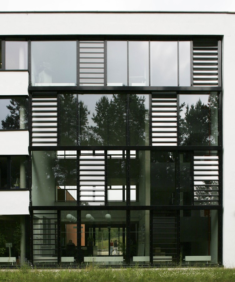 das neue haus zeigt sich als transparente, einbündige anlage, die sich als winkel zum haus 1 richtet. die winkelform wird aus der ecksituation weitergeführt. der endpunkt des mäanders wird durh den kreistagssaal gebildet, der an der nahtstelle zu gebäude 6 den haupteingang definiert.