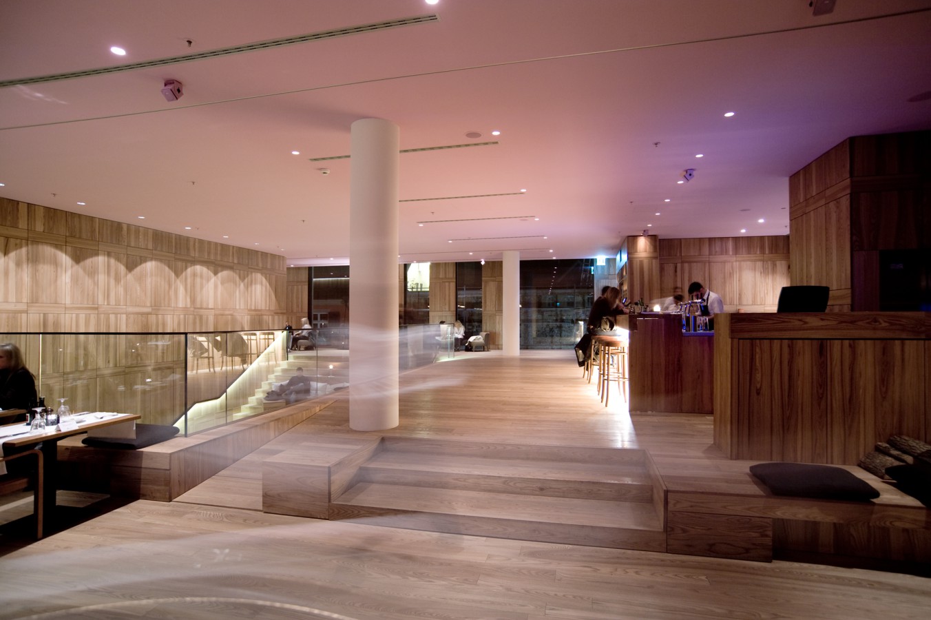 für das restaurant il boccone wurde das konzept vorgeschlagen, ein großes zweigeschossiges raumvolumen mit einer die geschosse verbindenden bespielbaren großtreppe zu konzipieren. im erdgeschoss wird das restaurant als kantine mit schiebeelementen zur aussenbestuhlung und mit an den straßenbelag assoziierenden grantiboden mit einfachem weissen gestühl entwickelt. im obergeschoss entsteht ein stadtchalet mit der atmosphäre von umgreifender holzvertäfelung, holzböden, der großen holztreppe ins erdgeschoss, kaminfeuer und der saalbestuhlung der 1920er jahre, welches mit einer rosa lackierten decke seinen raumabschluss findet.