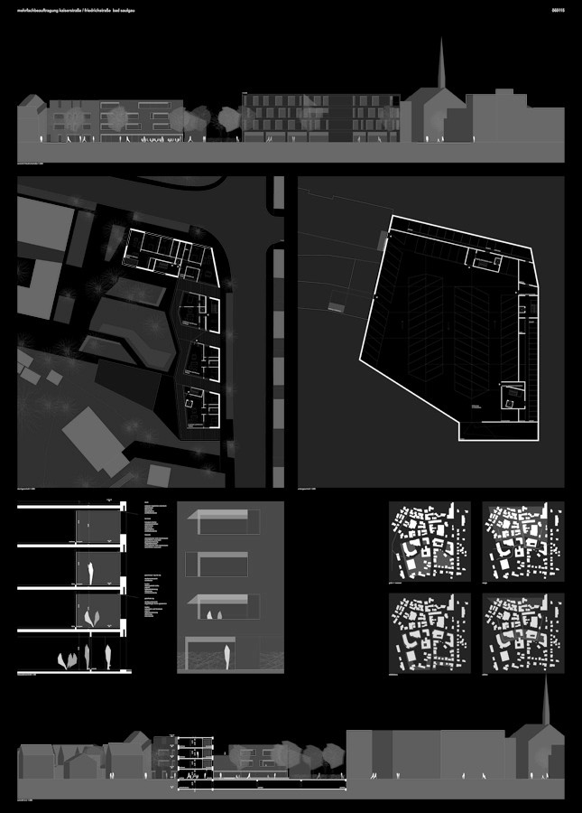 die erweiterung der bestehenden volksbank und des innenhofs wird an der friedrichsstraße platziert, in bezug zur stadt, straßenraum und geschützten neuen innenhof das cafe bar restaurant angeboten. weiterhin kann an der straßenecke zur kaiserstraße ein ladengeschäft entstehen. der eingang für die obergeschosse ist dem gartenbereich mit anbindung zur friedrichstraße zugeordnet. hier entstehen kurze und schöne anbindungen zum bestehenden internen eingang der volksbank. im ersten und zweiten obergeschoss entwickeln sich die dienstleistungen und im dachgeschoss die wohnungen die nach süden in den innenhof orientiert sind. die oberirdischen stellplätze werden der östlichen volksbankfassade mit baumgrün vorgestellt. die räume der caritas befinden sich zentral erdgeschossig mittig im bauwerk, zum einen an den straßenraum mit den öffentlichen stellplätzen zugeordnet, zum anderen mit den beratungs- und gruppenräumen zum ruhigen sonnigen innenhof ausgerichtet. die sozialstation wird im südlichen erdgeschoss platziert und entlang der südlichen arkaden gesetzt. die tagespflege und ruheräume richten sich zum geschützten gartenbereich und zum innenhof aus. über zwei treppenanlagen werden die wohnungen in den obergeschossen entwickelt, die erschließungen als verweilräume und treffpunkte entworfen. alle wohnungen folgen einem ordnungsprinzip, sind jedoch unterschiedlich in größe und form und immer der sonne, der ruhe und dem innenhof zugewandt. im zweiten obergeschoss wird eine gemeinschaftsterrasse nach südwesten angeboten. im dachgeschoss legen sich im duktus der weiteren wohnungen penthouses mit großen terrassen auf.