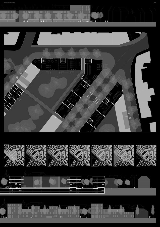 das neue wohnquartier wird konsequent in das bestehende stadtquartier döbele integriert. die angrenzenden fassaden der gründerzeitbebauungen bilden einen guten rahmen für die schaffung von hochwertigen verkehrsberuhigten bereichen zwischen den bestehenden gebäuden und den neuen gebäudeblöcken. der boulevard wird mit breiten geh und nutzflächen kurzzeitparkmöglichkeiten links und rechts auch für anlieferungen und dem straßenraum grosszügig gestaltet. es soll ein lebendiger grüner mit bäumen gesäumter boulevard entstehen. alle weiteren straßen werden als anliegerstraßen angeboten. es entstehen der wertigkeit entsprechend vier tiefgaragenzufahrten zwei in den anliegerstraßen ausschließlich für anlieger zwei an der grenzbachstraße für öffentliche nutzungen und anlieger. an der döbelestraße entsteht ein quartierstreffpunkt/kiosk etc. und bewirtung auf den platz und in die grünräume hinein. in der verlängerung döbelestraße/schützenstrasse ist es notwendig auch die angrenzenden straßenund platzräume in das verkehrsberuhigte quartierskonzept mit einzubinden. selbstverständlich können anlieger, busse, sowie fußgänger und radfahrer die flächen nutzen. innerhalb der neuen bebauungen entstehen grüne innenräume. passagen bilden verbindungsmöglichkeiten innerhalb des quartiers nach ost und west. eine passage nach norden ist die direkte verbindung zur döbelestraße. die passagen haben direkte anbindungen an die grünverbindungen am grenzbach. die aufnahme des themas wasser, regenwasser ist ein wichtiges freiraumplanerisches element.