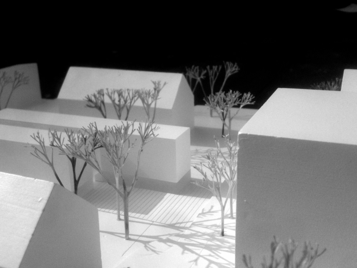 der baukörper übernimmt die gebäudestellung, richtung und höhe der beiden vorhandenen angrenzenden kasernenbauwerke. um die zwischenräume zwischen bestand und neuem bauwerk großzügig mit baumstrukturen zu füllen wird das studenwohnhaus mittig in den zwischenraum platziert. der neue baukörper wird als bauwerk vorgeschlagen, welcher sich mit zwei langgestreckten, verschobenen, schmale kuben mit zentraler erschließungsfuge darstellt. durch die verschiebung entstehen subtile aussenbezüge die den städtebaulichen ansatz prägen. der neue baukörper rückt mit seinem einleitenden kopfhaus an die haupterschließungsstraße heran und bildet hier zum einen den erlebbaren, additiven quartiersraum zum cherisy kindergarten und zum anderen einen neuen eingangsquartiersplatz unter den bestehenden bäumen, mit cafe und ladengeschäft, räumlich eingebunden in bezug zum kinogebäude, als auch zum im norden entstehenden studentenwohn"hochhaus". der durch die verschiebung ausgebildete aussenraum im südwesten vervollständigt den schönen vorhandenen wohngrünraum zu den bestehenden studentenwohngebäuden und dem cherisy kindergarten, auf welchem benutzbare sonnige grünflächen entstehen.