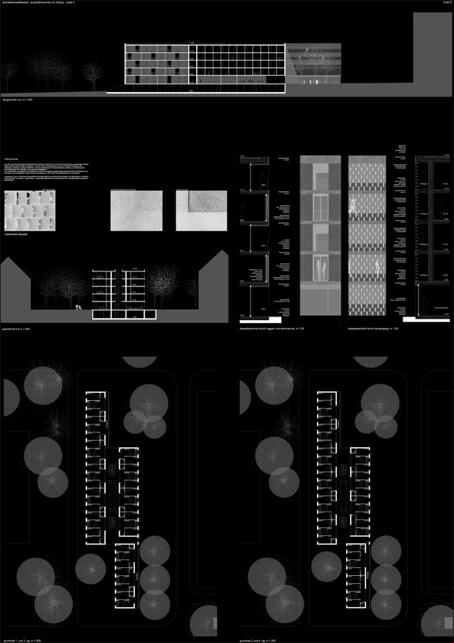 die studentenwohnungen sind funktional und konstruktiv modular aufgebaut und folgen dem prinzip von zwei studentenzimmern mit einem zwischen den zimmern liegenden gemeinschaftswohnraum mit loggia. durch den vorgelagerten flurbereich mit kochen und bad können aus dem modul heraus 1-, 2,- 3- und 4-zimmer wohnungen entstehen. die wohngemeinschaften in dem fünf geschossigen studentenhaus werden über zwei zentrale treppen und aufzüge erschlossen. die aus der verschiebung entstehenden beiden kopfbauten nach norden und süden werden, von der erschließungsfuge heraus, mit laubengangerschließung an der ostseite angeboten. dies gewährleistet, dass an den meist lärmbelasteten ost-, südost und südseiten hauptsächlich erschließungen und nebenraumfunktionen untergebracht wurden, die große mehrzahl der wohnungen werden nach westen ausgerichtet. durch das geländegefälle nach süden wird an dieser schmalen gebäudeseite eine ebenerdige sockelöffnung vorgeschlagen, durch welche die fahrradabstellräume, pkw stellplätze und weitere funktionen untergebracht werden.